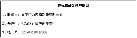 4.3、供應商報價文件資料遞交地點:重慶市南岸區廣陽鎮明月沱806號 , 重慶帝力游艇制造有限公司辦公樓二樓采購部。
